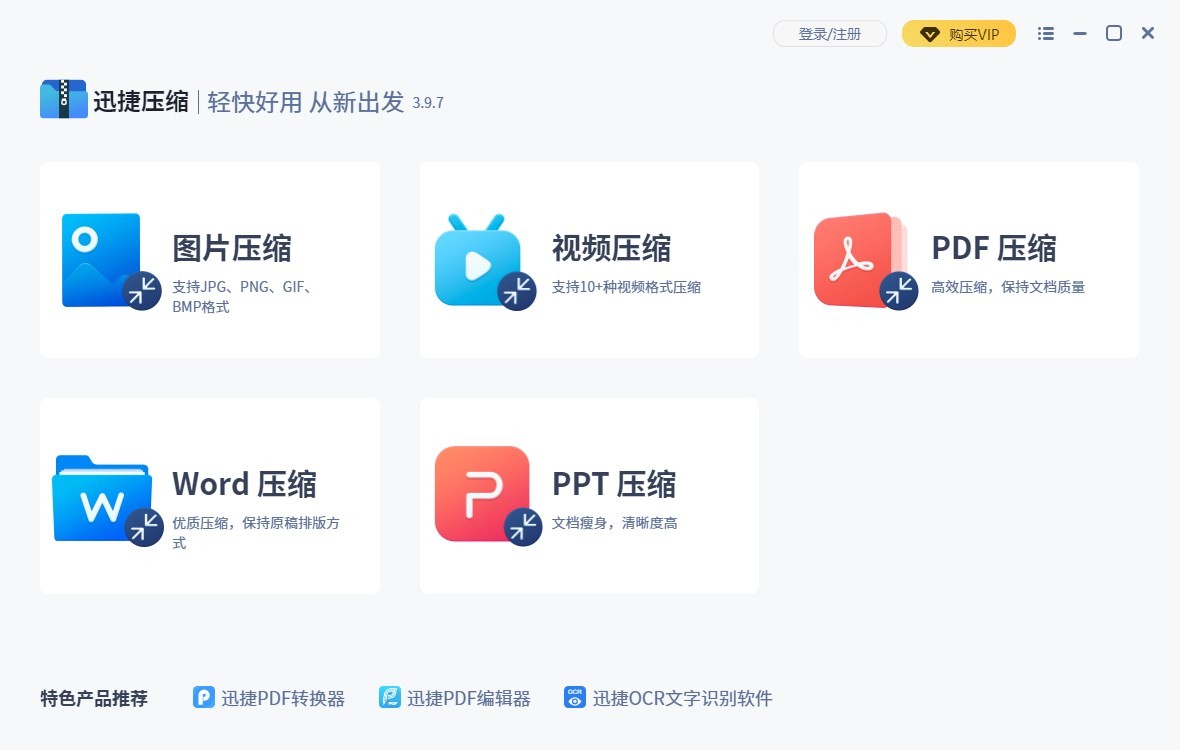 迅捷压缩是一款专业压缩软件,支持图片压缩、视频压缩及PDF压缩,可以使用OCR将压缩后的PDF转换为可编辑文本,普通压缩可保留文件质量,高级压缩可设置清晰度来压缩文件。